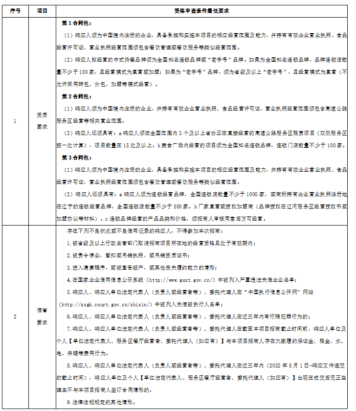 2.1項(xiàng)目概況:為滿足經(jīng)營需要,現(xiàn)對遼寧省高速公路遼河服務(wù)區(qū)中式快餐、美食廣場和水吧經(jīng)營業(yè)態(tài)進(jìn)行公開招商。