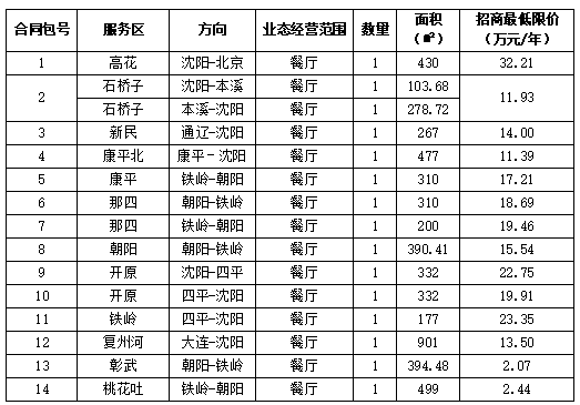 2.2招商范圍及合同包劃分:本次招商業態為石橋子、那四、開原服務區雙側餐廳共計6個;高花(沈陽—北京方向)餐廳1個、新民(通遼—沈陽方向)餐廳1個、康平(鐵嶺—朝陽方向)餐廳1個、康平北(康平—沈陽方向)餐廳1個、朝陽(朝陽—鐵嶺方向)餐廳1個、鐵嶺(四平—沈陽方向)餐廳1個、復州河(大連-沈陽方向)餐廳1個,彰武(朝陽-鐵嶺)餐廳1個,桃花吐(鐵嶺-朝陽)餐廳1個,本項目共劃分為14個合同包。
